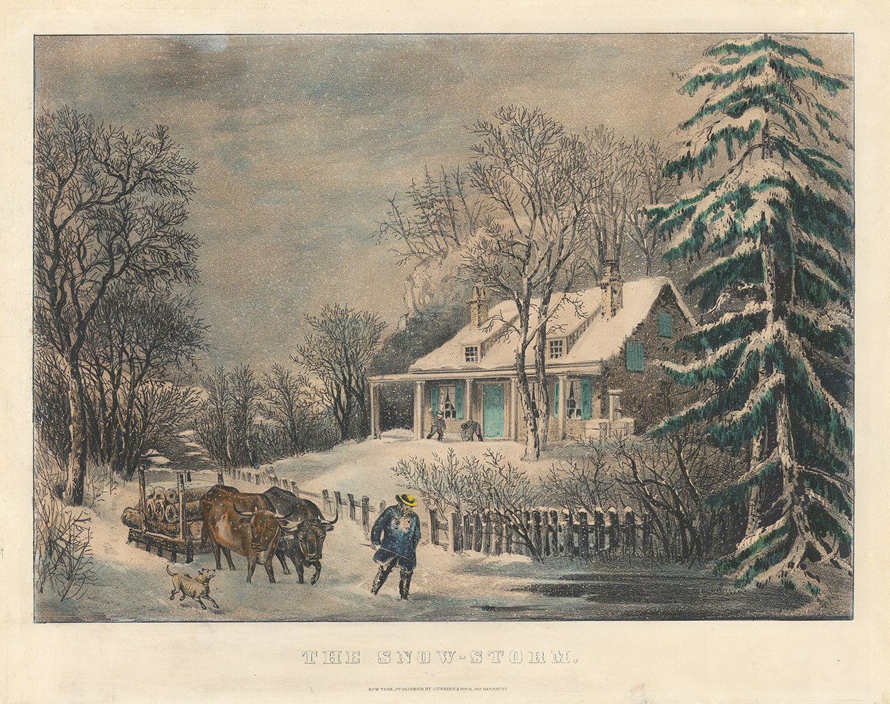 DESCRIPTION: A charming New England winter scene. A man leads a an oxcart down a snow covered road and two youths in front of the house having a snow ball fight.<br><br> New Best Fifty #40.