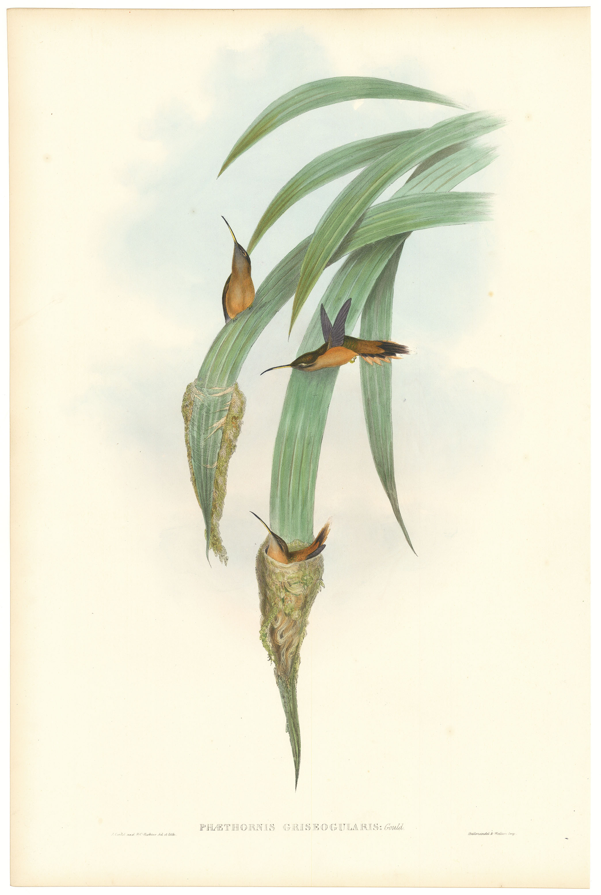 DESCRIPTION: From A Monograph of the Trochilidae, or Family of Humming-Birds, 6 vols., large folio. Published in London, 1849–1887. Printed by Hullmandel and Walter from drawings by J. Gould, H. C. Richter, and William Hart, lithographed by the artists. The Grey-throated Hermit is a slender and graceful species native to the humid forests of northern South America. It is characterized by its soft brown upper plumage, pale gray throat, and the distinctive decurved bill typical of the hermit group. In Gould’s hand-colored lithograph, the bird is shown feeding from a tubular blossom, its feathers delicately shaded and touched with metallic pigment to evoke a lifelike sheen. The composition conveys the bird’s subtle beauty and fluid motion, framed by lush foliage that reflects the quiet depth of its tropical environment. John Gould’s Monograph of the Trochilidae is one of the grand masterpieces of nineteenth-century ornithological illustration. Created over nearly forty years, it united Gould’s scientific insight with the artistic excellence of Henry Constantine Richter and William Hart. The Grey-throated Hermit plate exemplifies this collaboration, combining accuracy, grace, and rich hand-coloring to celebrate the understated elegance of one of the forest’s most elusive hummingbirds.
