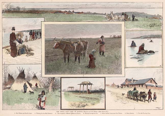 DESCRIPTION: Six views surround the center scene of "The Angelus - Mission Indians at Prayer". The lake of the title refers to Devil's Lake - a saline lake thirty miles long in northeast central North Dakota. Other scenes include ice fishing, a Sioux Indian camp and the Old Trading Post.