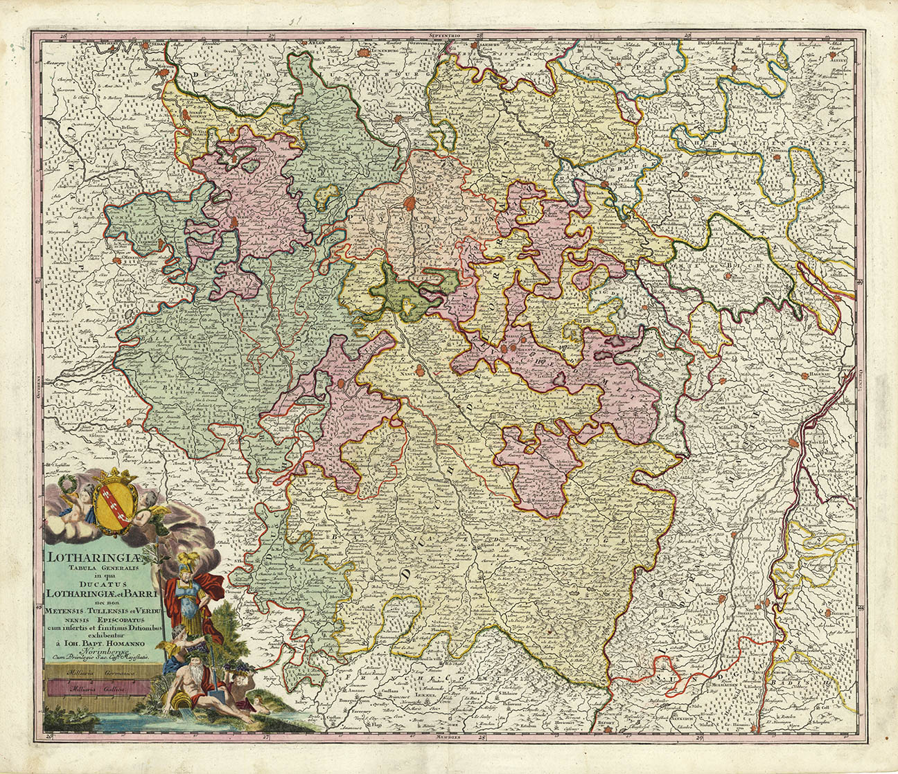 DESCRIPTION: Johann Baptist Homann, a German engraver and publisher who established himself and his family in Nuremberg in 1702. He published his first atlas, "Atlas Novus" in 1707, and in recognition of this achievement, he was elected to the Berlin Academy of Sciences. In 1715 Homann was appointed Geographer to the Emperor. Homann died in 1724 and his business was continued by his family under the name Homann's Heirs into the late 18th century. Homann's map are generally finely engraved, although often in a rather heavy handed style. The normal coloring for his maps is with an attractive wash color with the cartouche left uncolored. This map is unusual in that the cartouche has been handcolored. This is a nicely detailed map of the Lorraine district of north east France.