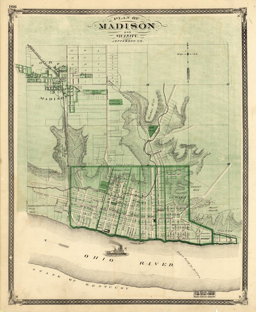 ADDITIONAL INFO: A detailed map from the "Illustrated Historical Atlas of the State of Indiana." On the reverse is a map of Jefferson County. The map is framed in by a nice diamond pattern and heart border.