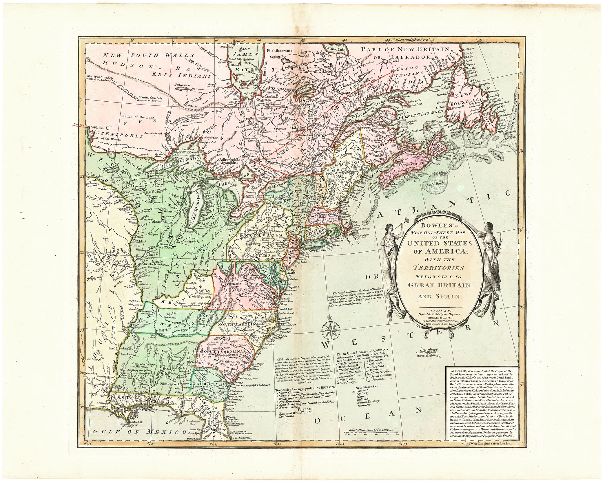 DESCRIPTION: The map was first issued by Richard Seale and Peter Bell in 1768. This version now shows the new states of Kentucky, Tennessee, and Vermont. Indiana is shown in the approximate present location of West Virginia. A large Western Territory is shown encompassing the present day states of Minnesota, Wisconsin, Illinois, Indiana, Ohio, and Michigan. An interesting and beautifully colored map of the young United States.