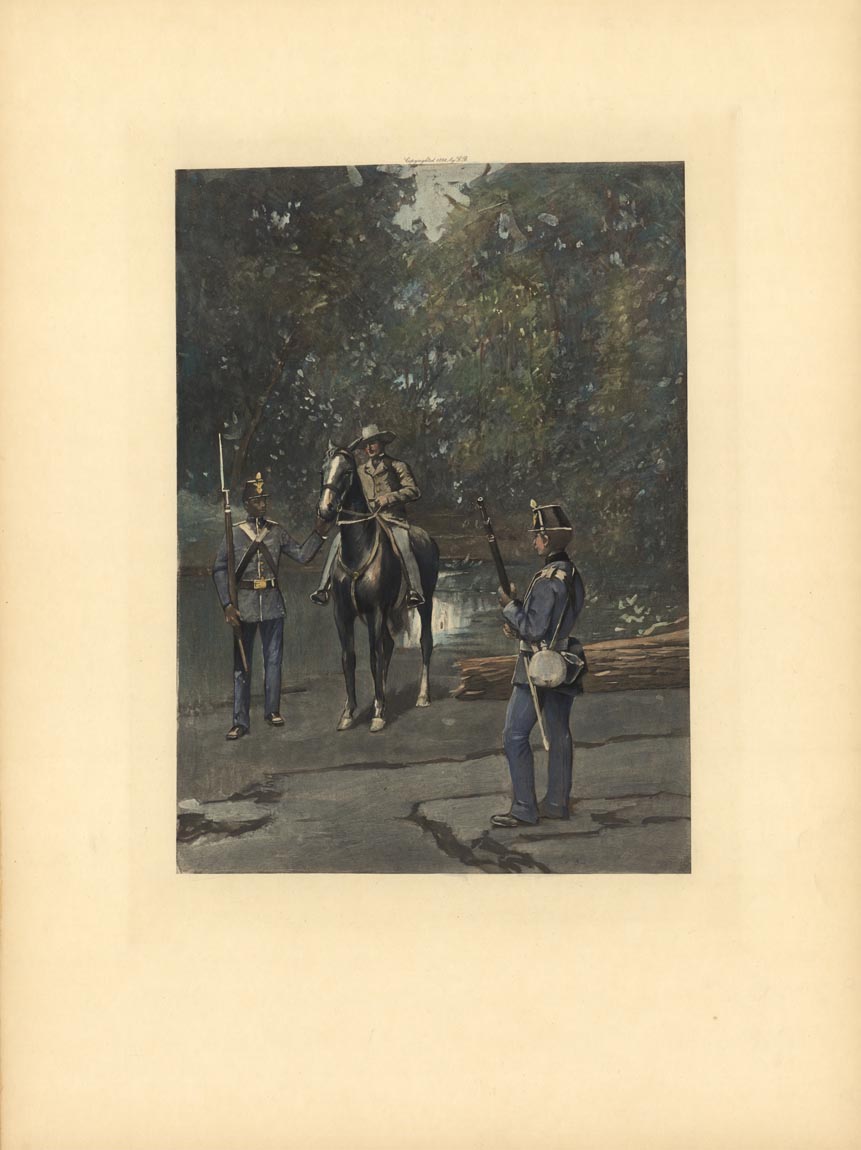 ADDITIONAL INFO: Hand colored photogravures drawn by well known artists for "Army and Navy of the United States," a series of portfolios illustrating military uniforms, equipment and battles.