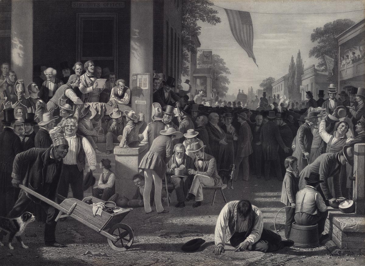 DESCRIPTION: George Caleb Bingham Lithograph, 1858-59. After a painting by George Caleb Bingham. Anonymous German lithographer 1858-59. <BR><BR> E. Maurice Bloch in George Caleb Bingham: A Catalogue Raisonne states that only two impressions of this print are known, both proofs before title. The two known impressions in the 1967 catalogue were in the collection of Mrs. A. S. Colgate of Tuxedo Park, N.Y. now in the Amon Carter Museum in Fort Worth, Texas and in the Estate of Curtis B. Rollins, Columbia, Missouri now in the Missouri Historical Society. Therefore this is the third known impression.<BR><BR> There are two stories as to why this print is so rare. The artist's son, J. R. Bingham, told one version to C. B. Rollins in 1909. According to J. R. Bingham, Goupil was hired to publish the print in 1870 and two proofs were produced and sent to the artist for his approval. By the time the order for 5,000 prints arrived in Paris, the Franco-Prussian War had started and the stone had been destroyed at Goupil's printing studio. <BR><BR> E. Maurice Bloch discovered another scenario. Citing a letter written by George C. Bingham on June 3, 1857, the artist stated that he did not want to sell the publication rights to Goupil but wanted to publish the print for his own benefit. Unable to find a lithographer in Paris, he located one in Dusseldorf, Germany, where he was staying. In August 1858 Bingham indicated that the work was in progress but that there had been some difficulties with the lithographer and the completion of the print had been delayed. It is obvious that the project was eventually finished; however, there was no edition ever printed. <BR><BR> George Caleb Bingham is considered by many to be America's finest genre painter. A number of his printed images have a political theme. Three large prints were produced after his “Election Series” paintings. The first published was the “County Election,” second “Stump Speaking,” and as discussed above “The Verdict of the People” exists in proofs only.<BR><BR> Bingham was sent to the Whig convention at Rocheport, Missouri in 1840. It is believed that at this time he must have realized the artistic possibilities of the political scene and filled his drawing book up with sketches which were later utilized for his large compositions.