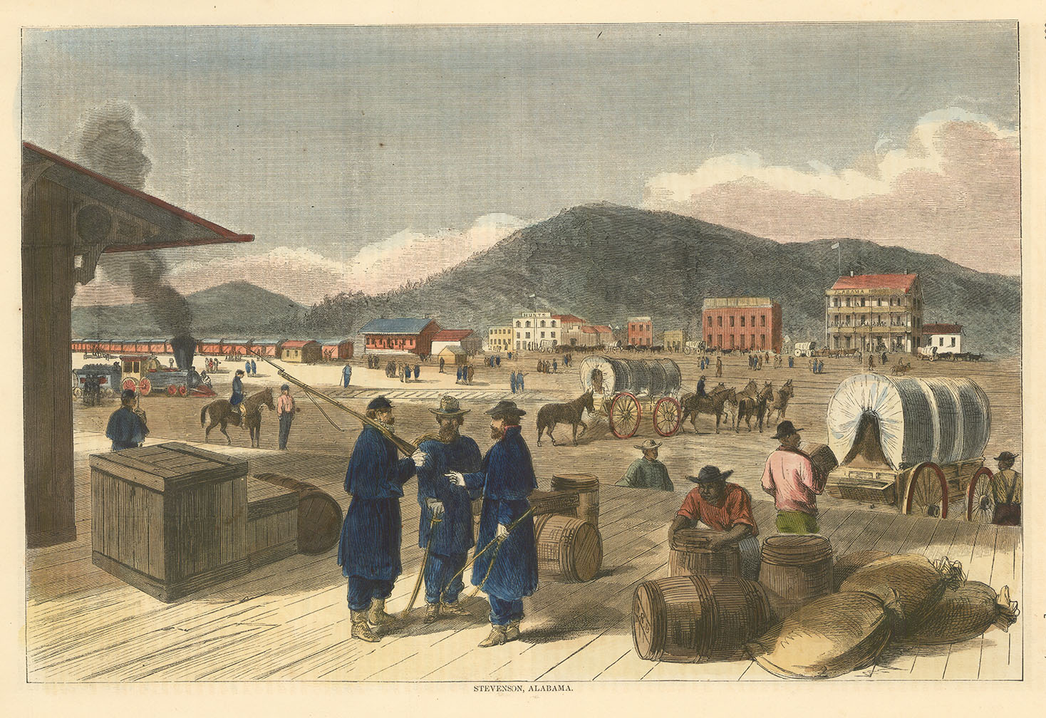 DESCRIPTION: A 19th-century perspective of Stevenson, Alabama., captured as a wood engraving and hand colored to highlight the details.