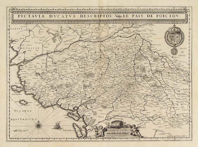 ADDITIONAL INFO: Finely detailed map of Poitou region of France. A coat of arms appears in the upper right corner. On the back of this map is a description in Spanish of the region.