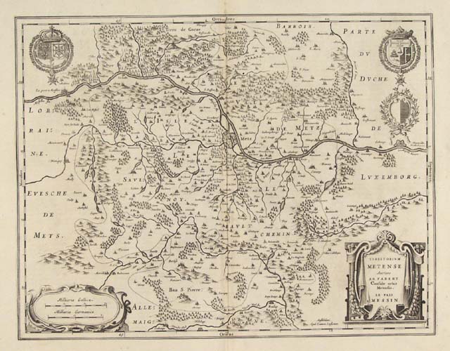 DESCRIPTION: Detailed map of the territory surrounding Metz, France. Two coats of arms appear in the upper right corner, and another appears in the upper left. On the back of this map is a description in Spanish of the region.