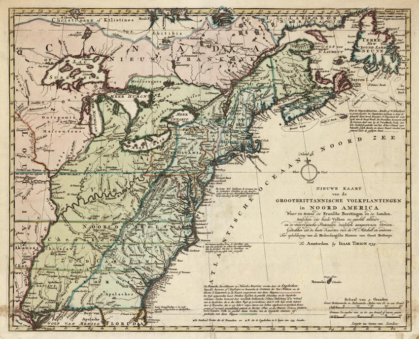 DESCRIPTION: A fine map from Tirion's atlas "Nieuwe en Boknopte Hand – Atlas." Editions of this great atlas date from before 1740 to just after 1784. This map from a circa 1755 issue and is based on Dr. John Mitchell’s seminal map of America. This particular impression has strong, bright original hand coloring. A short history of the region is given. Georgia, Virginia and North and South Carolina are shown extending westward to the Mississippi.