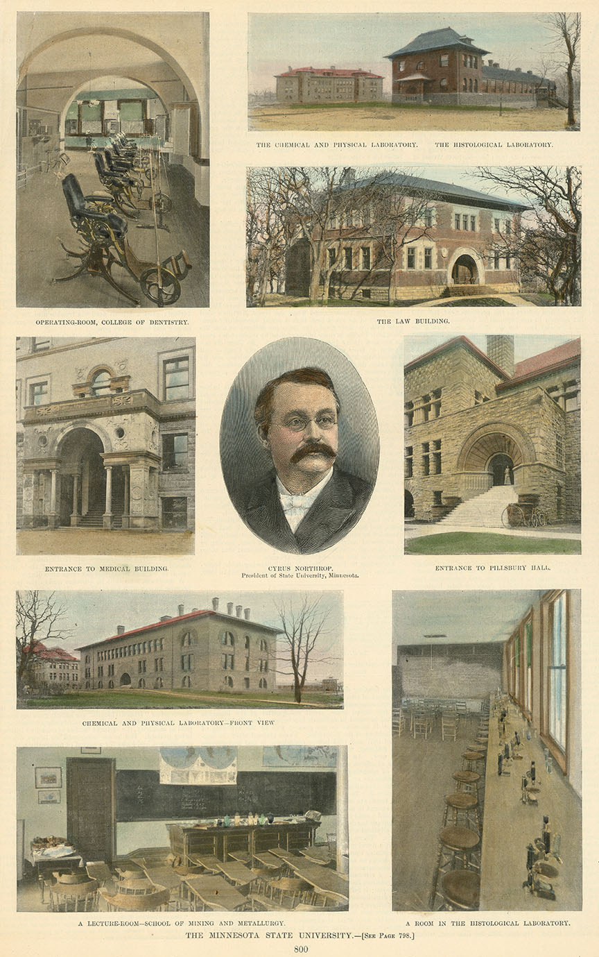 DESCRIPTION: A finely colored wood-engraved portrait of Cyrus Northrop, President of the University of Minnesota, surrounded by eight photogravure views of campus buildings. The scenes include the Operating Room of the College of Dentistry, the Chemical and Physical Laboratory, the Histological Laboratory, the Law Building, the Entrance to the Medical Building, the Entrance to Pillsbury Hall, a front view of the Chemical and Physical Laboratory, a lecture room in the School of Mining and Metallurgy, and a room in the Histological Laboratory.