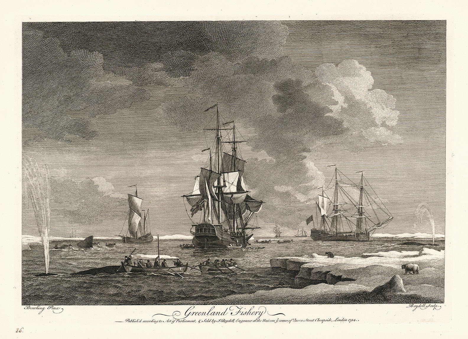 DESCRIPTION: Scene of British ships and boats pursuing three whales. A glacier with two polar bears appears in the foreground in the right corner. Engraved by John Boydell.