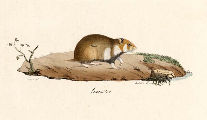 DESCRIPTION: A hamster from "Histoire Naturelle des Mammiferes, avec des figures originales enluminees, dessinees d'apres des animaux vivants". Published in Paris, A l'Imprimeire Lithographique de C. De Lasteyrie, Lithographe du Roi et de S.A.R. Mgneur. le duc d'Angouleme, rue du Bac, no. 58.