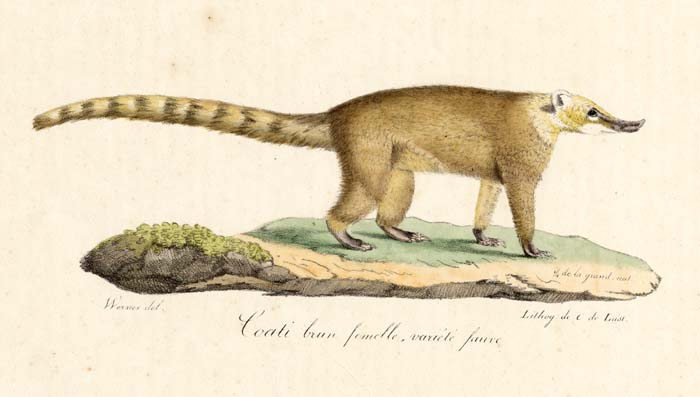 DESCRIPTION: A female brown coati from "Histoire Naturelle des Mammiferes, avec des figures originales enluminees, dessinees d'apres des animaux vivants". Published in Paris, A l'Imprimeire Lithographique de C. De Lasteyrie, Lithographe du Roi et de S.A.R. Mgneur. le duc d'Angouleme, rue du Bac, no. 58.