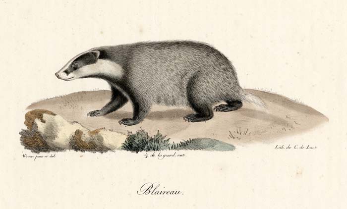 DESCRIPTION: A badger from "Histoire Naturelle des Mammiferes, avec des figures originales enluminees, dessinees d'apres des animaux vivants". Published in Paris, A l'Imprimeire Lithographique de C. De Lasteyrie, Lithographe du Roi et de S.A.R. Mgneur. le duc d'Angouleme, rue du Bac, no. 58.