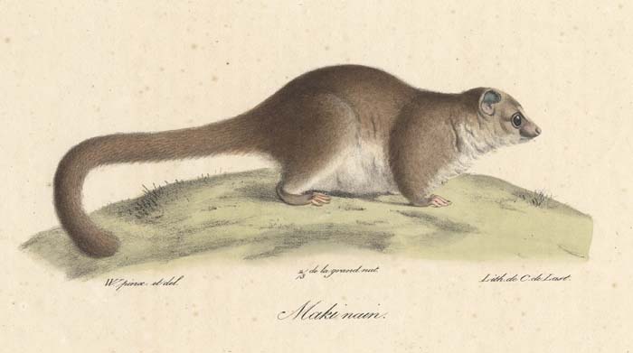 DESCRIPTION: A dwarf lemur from "Histoire Naturelle des Mammiferes, avec des figures originales enluminees, dessinees d'apres des animaux vivants". Published in Paris, A l'Imprimeire Lithographique de C. De Lasteyrie, Lithographe du Roi et de S.A.R. Mgneur. le duc d'Angouleme, rue du Bac, no. 58.<br><br> The animal in this lithograph is a species of lemur. The term "maki" is the French translation of the Malagasy word "maky" meaning "lemur." The one pictured here might be the mouse lemur or the cheirogaleidae.