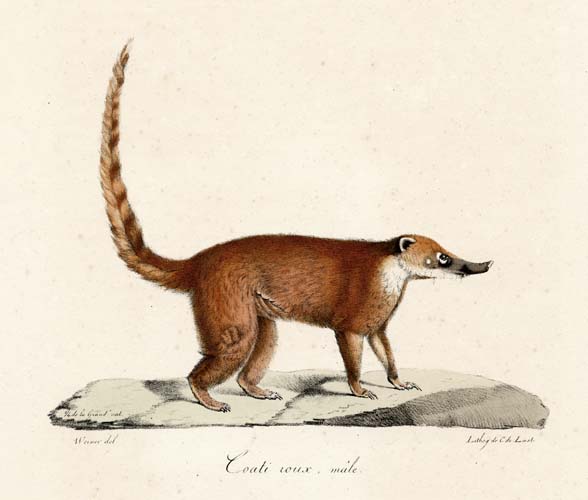 ADDITIONAL INFO: A male red coati from "Histoire Naturelle des Mammiferes, avec des figures originales enluminees, dessinees d'apres des animaux vivants". Published in Paris, A l'Imprimeire Lithographique de C. De Lasteyrie, Lithographe du Roi et de S.A.R. Mgneur. le duc d'Angouleme, rue du Bac, no. 58.