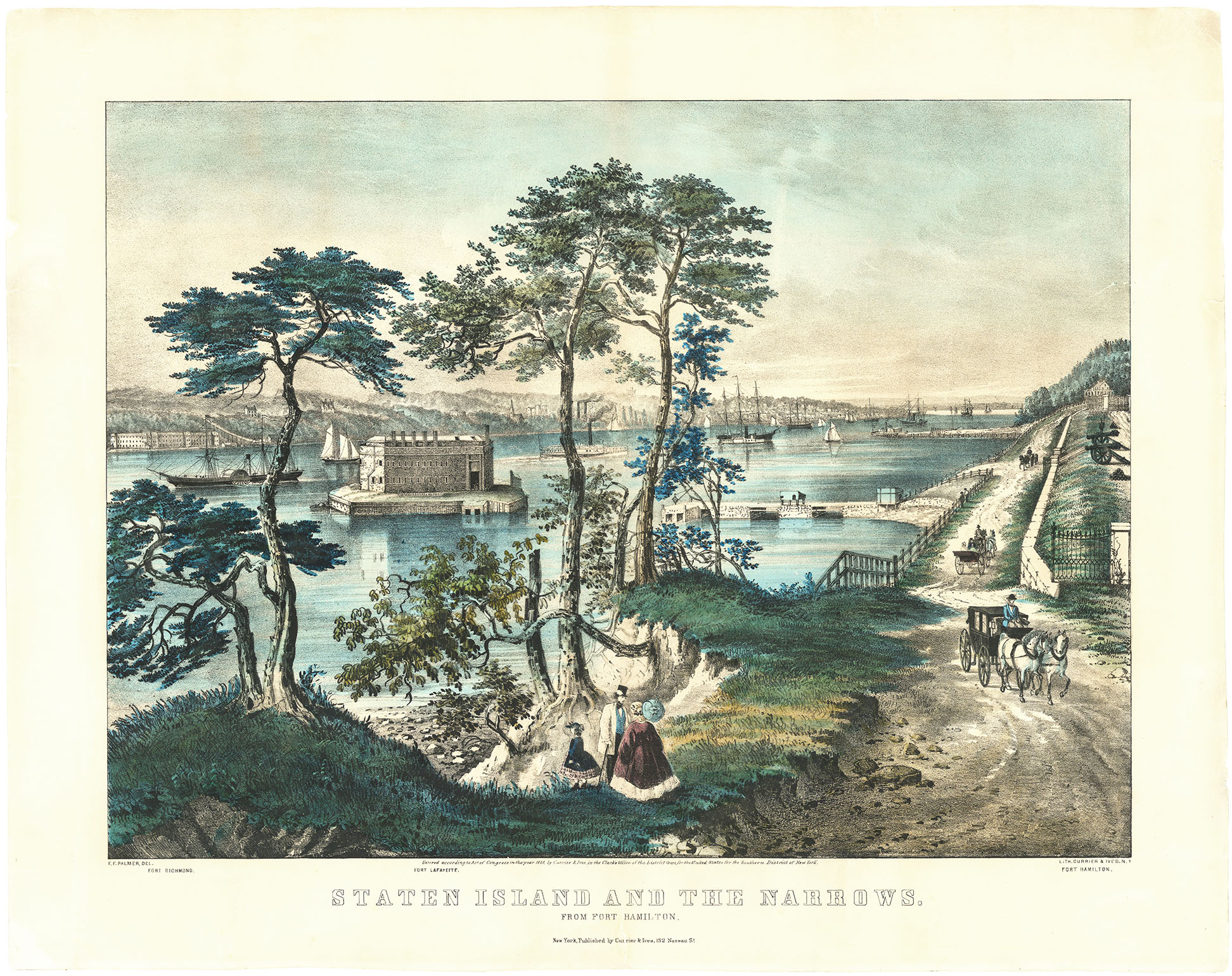 DESCRIPTION: F. F. Palmer, del. Lith. Keyed below the image are Fort Richmond, Fort Lafayette, and Fort Hamilton.