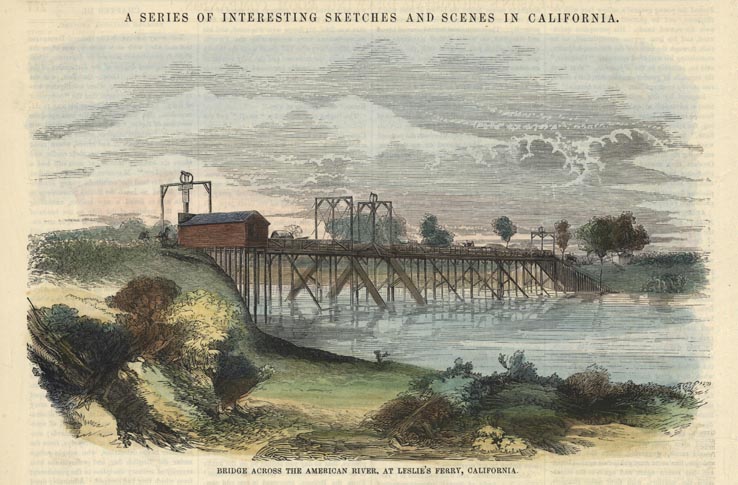 DESCRIPTION: A 19th-century perspective of the Bridge Across the American River, at Leslie's Ferry, California. captured as a wood engraving and colorized to highlight the details. The bridge at Leslie’s Ferry spans the American River in California, completed in September 1851. It holds significance as the largest and most robust structure of its kind in the state, measuring 620 feet in length, 25 feet in width, and standing 30 feet above low water mark. This bridge connected a northern road out of Sacramento with the Marysville road on the north side of the river, crucial for transportation during California's early development.