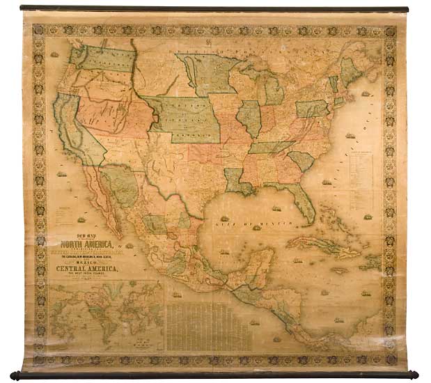 MEDIUM: Large engraved wall map on linen with original wooden rollers.