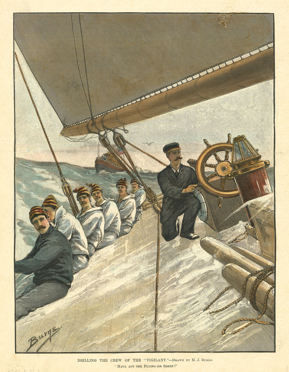 DESCRIPTION: On deck view of Caption and crew. The Vigilant was the victorious defender of the 1893 America's Cup race. She was also the first Herreshoff designed America's Cup boat.