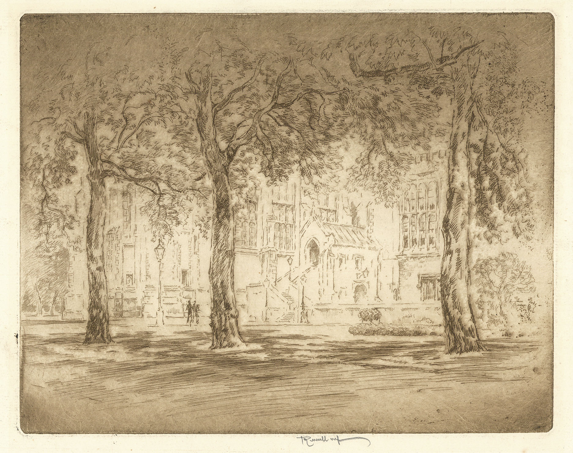 DESCRIPTION: Signed in pencil. <br><br> This finely detailed etching depicts Lincoln’s Inn Fields in London, one of the city’s largest and most historic public squares, surrounded by notable 17th- and 18th-century architecture. Pennell’s composition captures the quiet urban elegance and the interplay of light and shadow that define his London scenes, reflecting his admiration for the city’s timeless character.