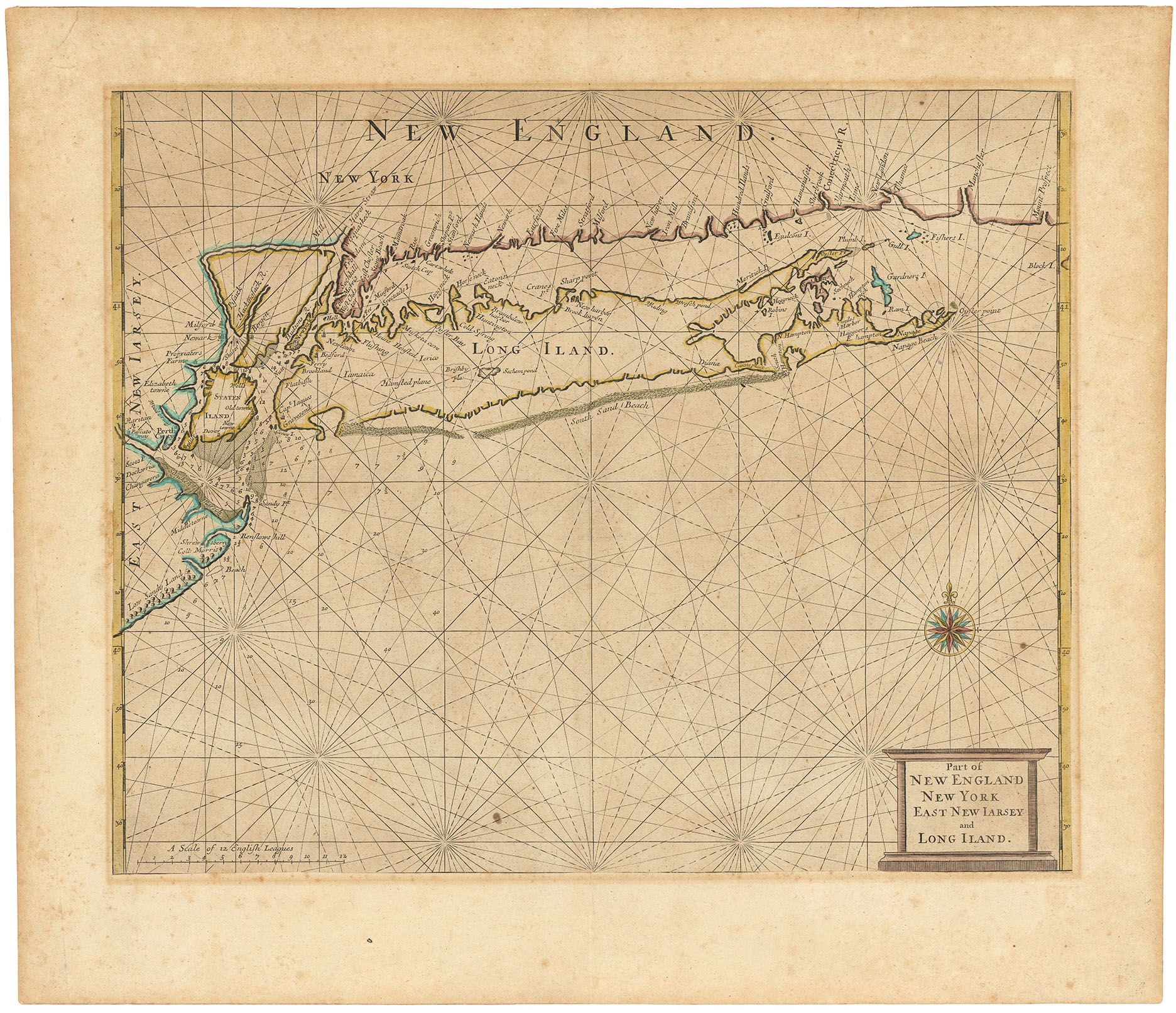 DESCRIPTION: The first printed map to depict Long Island accurately. It took European explorers and colonists more than 200 years to determine the correct shape of the island. The earliest maps, based on the voyages of Verazzano, depict Long Island as a peninsula named Flora. In 1614, Adriaen Block was the first to show it correctly as an island. In later years different cartographers depicted Long Island in many shapes and sizes, even an archipelago. An exact source for this map was not given by Thornton. It has been suggested that this map was loosely based on the manuscript chart by Robert Ryder made in 1674. Recent research suggests that Phillip Wells, who was Surveyor General of the Colony of New York in 1683, may likely have had a hand in it. On the northern shore of Staten Island is the name "Wells," the home of Phillip Wells. Wells is known to have surveyed the boundary between New York and Connecticut. This map appeared in early editions of "The English Pilot, The Fourth Book" published by John Thornton and William Fisher (1689-1713) and in the "Atlas Maritimus" (1704 and 1708). There are two states of this map with this being the first. The second state has additional engraved soundings east of "Renslows Hill" in New Jersey. It is rare in either state.