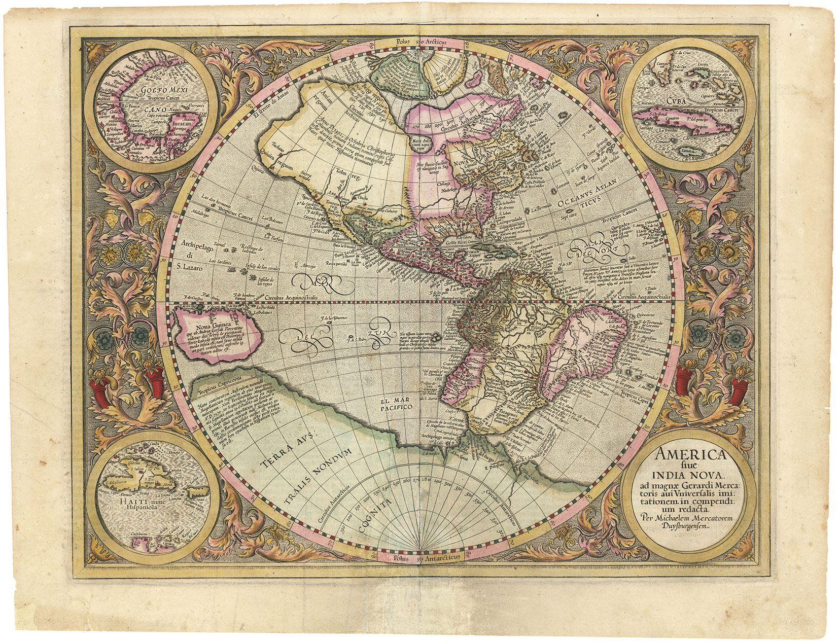 DESCRIPTION: One of the most striking early maps of the Western Hemisphere. Michael Mercator, grandson of Gerard, engraved this plate, the only known printed map by him. Cartographically, this map was based on Mercator's landmark world map of 1587. This map is set within a circle surrounded by a design of interlocking acanthus leaves, cornucopias and insects. There are three inset maps, the Gulf of Mexico, Cuba and Florida, and Hispaniola and Puerto Rico. Also depicted are a Northwest Passage, a large island of New Guinea and a huge Antarctic continent. <br><br>