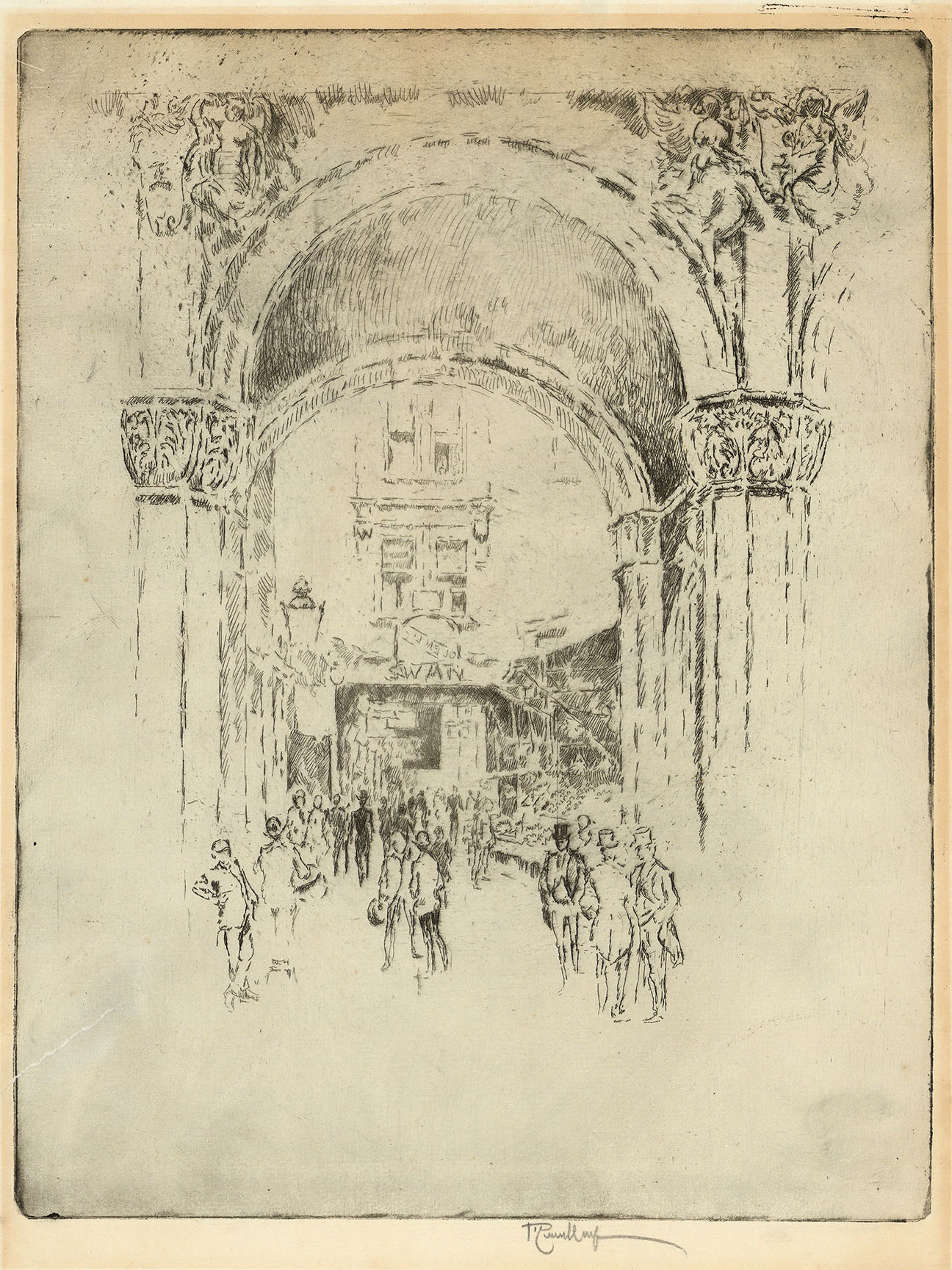 DESCRIPTION: Signed in pencil.. The Swan at Leadenhall, London is an etching by Joseph Pennell made in 1903. It shows the old Swan Tavern in Leadenhall Market, surrounded by the narrow streets of the city. Pennell’s careful linework captures both the texture of the buildings and the movement of daily life, with people and carriages passing through the busy market. The print reflects his love for London’s older quarters and his talent for turning ordinary city scenes into works full of character and atmosphere.
