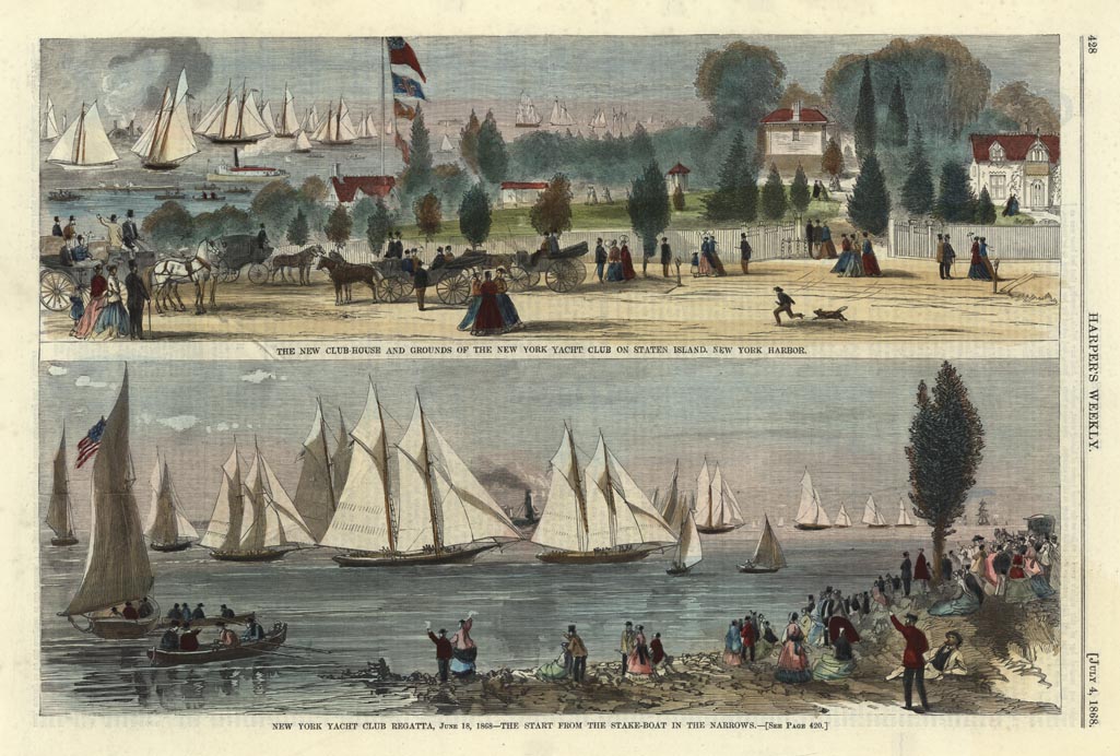 DESCRIPTION: Upper view is titled "The New Club House and Grounds of the New York Yacht Club on Staten Island, New York Harbor".