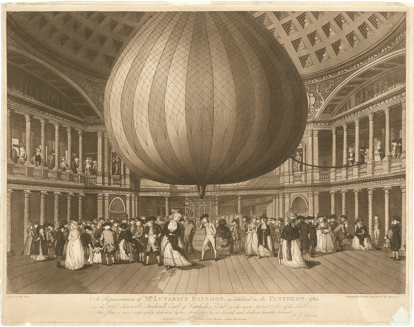 DESCRIPTION: Drawn by F. G. Byron. Aquatint by F. Jukes. Engraved by V. Green, Engraver to His Majesty, &c.<br><br> Title continues "To the Right Honourable Frederick Earl of Carlisle, Knight of the most Ancient Order of the Thistle, &c, &c. This Plate is most respectfully dedicated by his Lordship's most devoted and obedient humble Servant. F. G. Byron"<br><br> The Daredevil Aeronaut<br><br> Vincenzo Lunardi (1754–1806) was a pioneering Italian aeronaut.<br><br> Vincent Lunardi and his partner George Biggin together decided to demonstrate a hydrogen balloon flight at the Artillery Ground of the Honourable Artillery Company in London on September 15th, 1784.<br><br> The 200,000-strong crowd (which included the Prince of Wales) had grown impatient, the young Italian had to take off without Biggin, and with a bag that was not completely inflated; he was accompanied by a dog, a cat and a caged pigeon. The flight from the Artillery Ground travelled roughly 24 miles in two and a half hours eventually landing in Standon Green End.<br><br> After this celebrated event, the partially inflated balloon was hung in the Pantheon for a public view. During this event the scene was recorded by the artist F.G. Byron. The print was engraved by Francis Jukes and Valentine Green.<br><br>