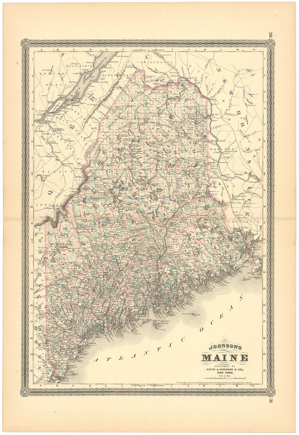 DESCRIPTION: A handsome map from "Johnson's New Illustrated Family Atlas of the World...." This detailed map notes railroad lines, lakes, rivers, counties and principal cities. The map is surrounded by a finely engraved calligraphic border. A nice bright and well colored impression.