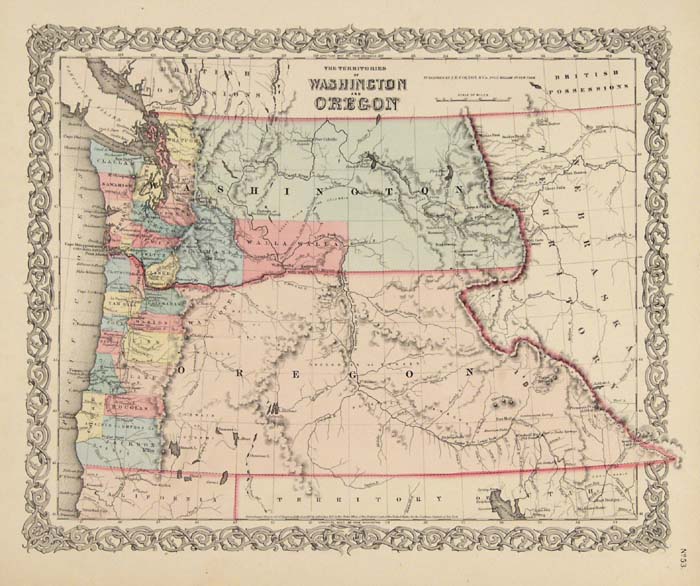 DESCRIPTION: A decorative and well engraved map (plate No. 53) from "Colton's Atlas of the World." This map is a fine representation of the early configuration of Washington and Oregon Nebraska Territory is seen in the upper right. Locations of Indian tribes, forts, trails, geographical features and proposed railroad lines are all shown. This map varies from the standard Colton stlas map as the title starts with "The Territories of." A nice bright impression.