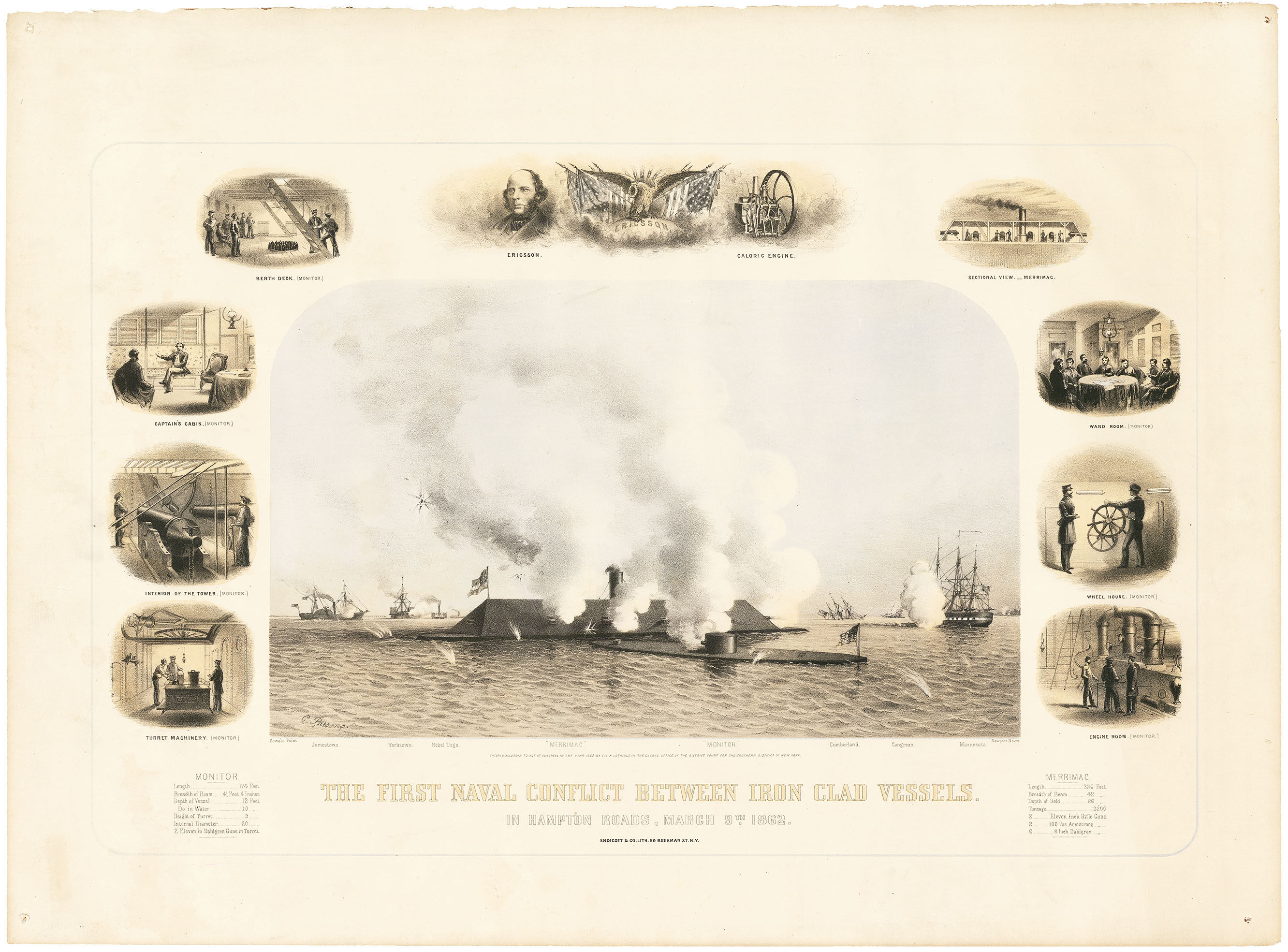 DESCRIPTION: This battle scene between the Monitor and the Merrimac includes other naval vessels visible just behind the ironclads. All the vessels are identified, as is the geography, under the image: "Sewals Point, Jamestown, Yorktown, Rebel Tugs, Merrimac, Monitor, Cumberland, Congress, Minnesota, Newport News." There are eight small vignettes - showing details of the ships interiors - 7 of the Monitor, 1 of the Merrimac. All of this is topped by a portrait of Ericsson and his Caloric Engine.