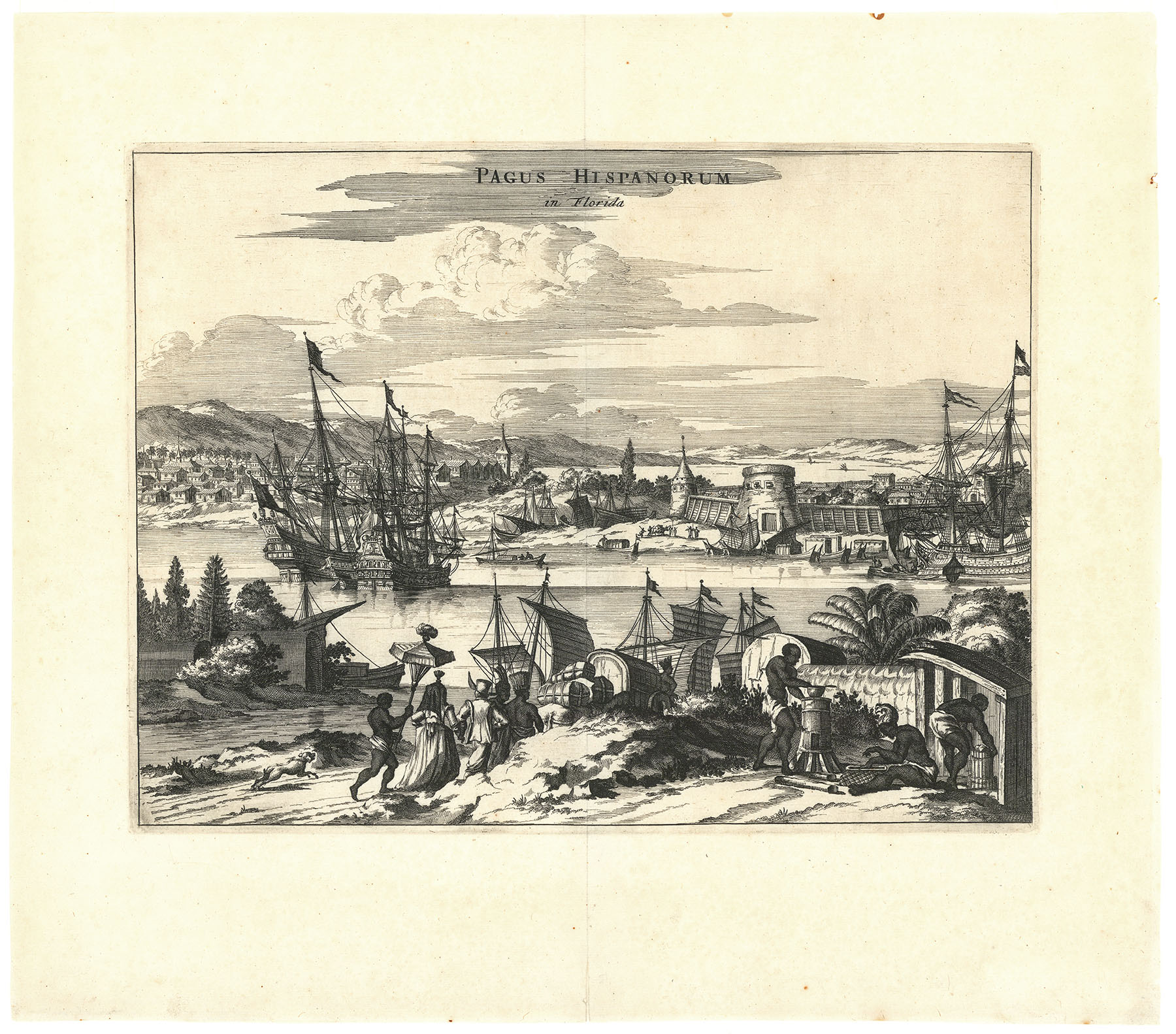 DESCRIPTION: This is a rich clean impression of Ogilby’s view of St. Augustine. One of the oldest cities in the U. S., St. Augustine was founded in 1565 by Pedro Menendez to protect the Spanish trade routes to the colonies. Menendez named the settlement St. Augustine, after the day of the festival of San Augustine. The first publicized plan of the city was sketched by Boazio, the artist who traveled with Sir Francis Drake, in 1586, when Drake sacked the port. <br><br> This view, which was re-engraved for Montanus and Ogilby, came from Gerrit van Schagen’s work, and depicts a fictionalized view of the town with mountains and other fanciful embellishments. This view appeared in John Ogilby’s seminal atlas "America: Being the Latest, and Most Accurate Description of the New World," published in London in 1671. Ogilby’s work is an English translation of Arnoldus Montanus’ Die Nieuwe en onbekende Weereld, . . ." which was produced in Amsterdam earlier the same year. <br><br> Considered the first encyclopedias of the Americas, both texts are richly illustrated with maps, views, and portraits. With little exception, Ogilby’s work is a direct copy of Montanus’ atlas. Ogilby did expand his atlas by adding fresh material on the English colonies. Illustrated with over 122 magnificent engravings, Ogilby’s America was the most accurate compendium available of the New World.