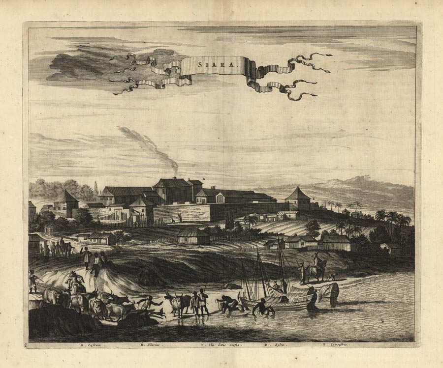DESCRIPTION: A finely engraved view of a fortified town in the state of Ceara, Brazil. Locals herd cattle and horses along the waterside and load boats with trade goods. The title is encased in a beautiful ribbon banner in the upper section of the image. <br><br> This view appeared in John Ogilby’s seminal atlas "America: Being the Latest, and Most Accurate Description of the New World," published in London in 1671. Ogilby’s work is an English translation of Arnoldus Montanus’ "Die Nieuwe en onbekende Weereld. . . ," which was produced in Amsterdam earlier the same year. Considered the first encyclopedias of the Americas, both texts are richly illustrated with maps, views, and portraits. With little exception, Ogilby’s work is a direct copy of Montanus’ atlas. Ogilby did expand his atlas by adding fresh material on the English colonies. Illustrated with over 122 magnificent engravings, Ogilby’s America was the most accurate compendium available of the New World.
