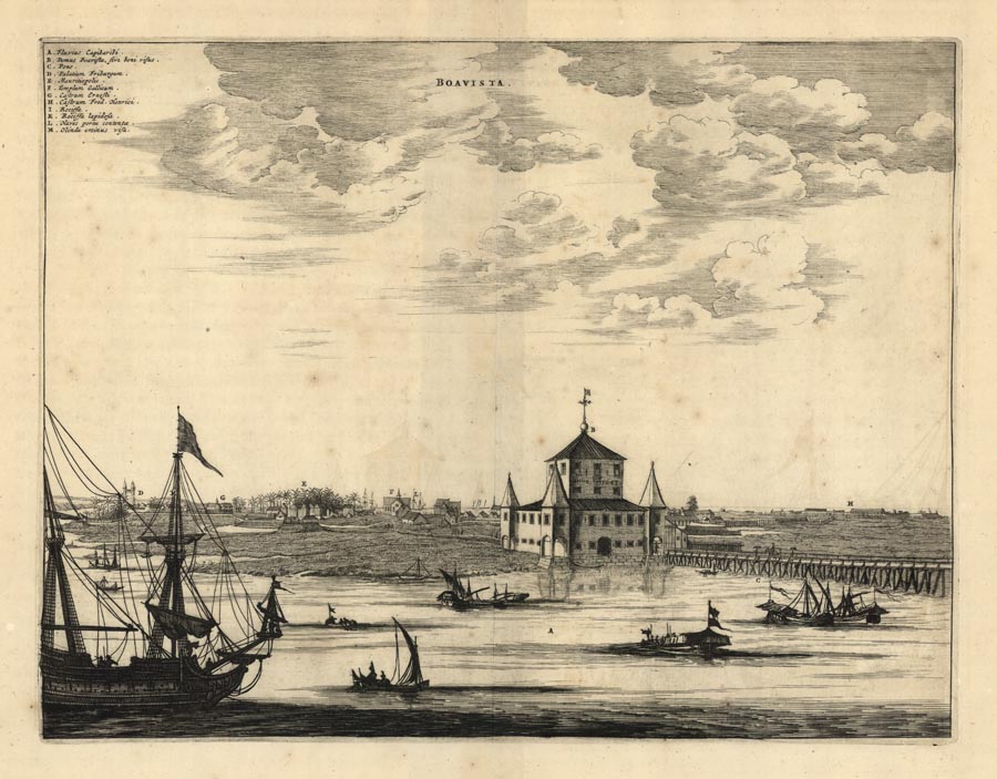 DESCRIPTION: In the late 1630’s Holland attempted to reassert its claim over Brazil by establishing a series of forts along the coastline. It is one of the best documented colonies because of the expedition led by Prince Maurits of Nassau, who attempted to assemble an intellectual court in the New World. He brought with him a group of highly accomplished artists, mapmakers, and scientists to record the mysteries of Brazil. They included the celebrated painter Frans Post, and the astronomer George Markgraf, who produced the first serious study of the southern sky. Post painted a wealth of images of the Brazilian landscape and the surrounding vegetation and wildlife. His works are some of the earliest European paintings of Brazil and were eagerly reproduced in print by Dutch engravers. <br><br> This impressive view depicts Boavista, a banqueting house, built by Nassau along the Capivaribi River. During his time in Brazil, Nassau built two bridges that connected Antonio Vas Island to the mainland. The first bridge spanned the Biberibi River between Recife and Antonio Vas, and the second, which is pictured in this image, crossed the Capivaribi River to the mainland. The Capivaribi bridge was comprised of eighty-six timber rods and took over seven weeks to erect. To celebrate this vast achievement, Nassau built a large banqueting hall next to the bridge. The building had four turrets, a large terrace, and a commanding view of the surrounding countryside. <br><br> This view appeared in John Ogilby’s seminal atlas "America: Being the Latest, and Most Accurate Description of the New World," published in London in 1671. Ogilby’s work is an English translation of Arnoldus Montanus’ "Die Nieuwe en onbekende Weereld. . . ," which was produced in Amsterdam earlier the same year. Considered the first encyclopedias of the Americas, both texts are richly illustrated with maps, views, and portraits. With little exception, Ogilby’s work is a direct copy of Montanus’ atlas. Ogilby did expand his atlas by adding fresh material on the English colonies. Illustrated with over 122 magnificent engravings, Ogilby’s America was the most accurate compendium available of the New World.