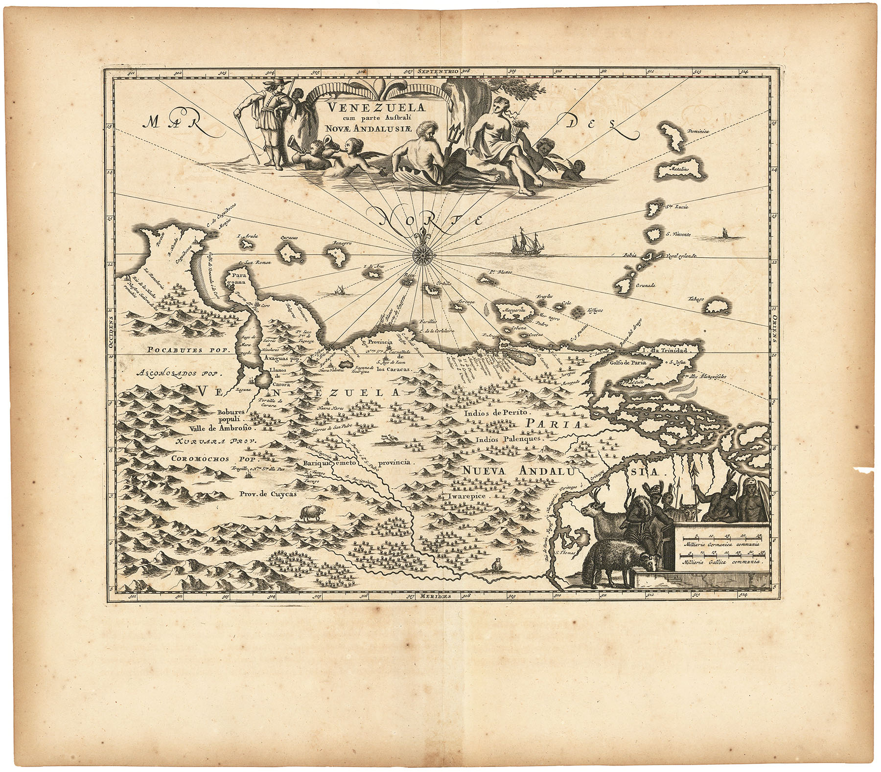 DESCRIPTION: The general outline of South America was fairly well known to cartographers and mapmakers by the end of the sixteenth century. Following Magellan’s momentous voyage around the southern tip of South America, both the eastern and western coasts of the continent were extensively explored. A wealth of maps were produced by European publishers depicting the individual regions in South America, as well as the continent as a whole. Based on Jansson’s map of the same title, this map is part of a series of identical charts published by the major map houses across Europe. Blaeu also did an almost identical version of this map for his "Grand Atlas." The map shows the coastline of Venezuela from Nuestra Senora de los Remedios to the mouth of the Orinoco River. The islands of Aruba, Curacao, and Bonaire are shown. The Lesser Antilles is depicted in the upper section of the map as is a large decorative cartouche showing Neptune and mermaids. This map appeared in John Ogilby’s seminal atlas "America: Being the Latest, and Most Accurate Description of the New World," published in London in 1671. Ogilby’s work is an English translation of Arnoldus Montanus’ "Die Nieuwe en onbekende Weereld. . . ," which was produced in Amsterdam earlier the same year. Considered the first encyclopedias of the Americas, both texts are richly illustrated with maps, views, and portraits. With little exception, Ogilby’s work is a direct copy of Montanus’ atlas. Ogilby did expand his atlas by adding fresh material on the English colonies. Illustrated with over 122 magnificent engravings, Ogilby’s America was the most accurate compendium available of the New World.