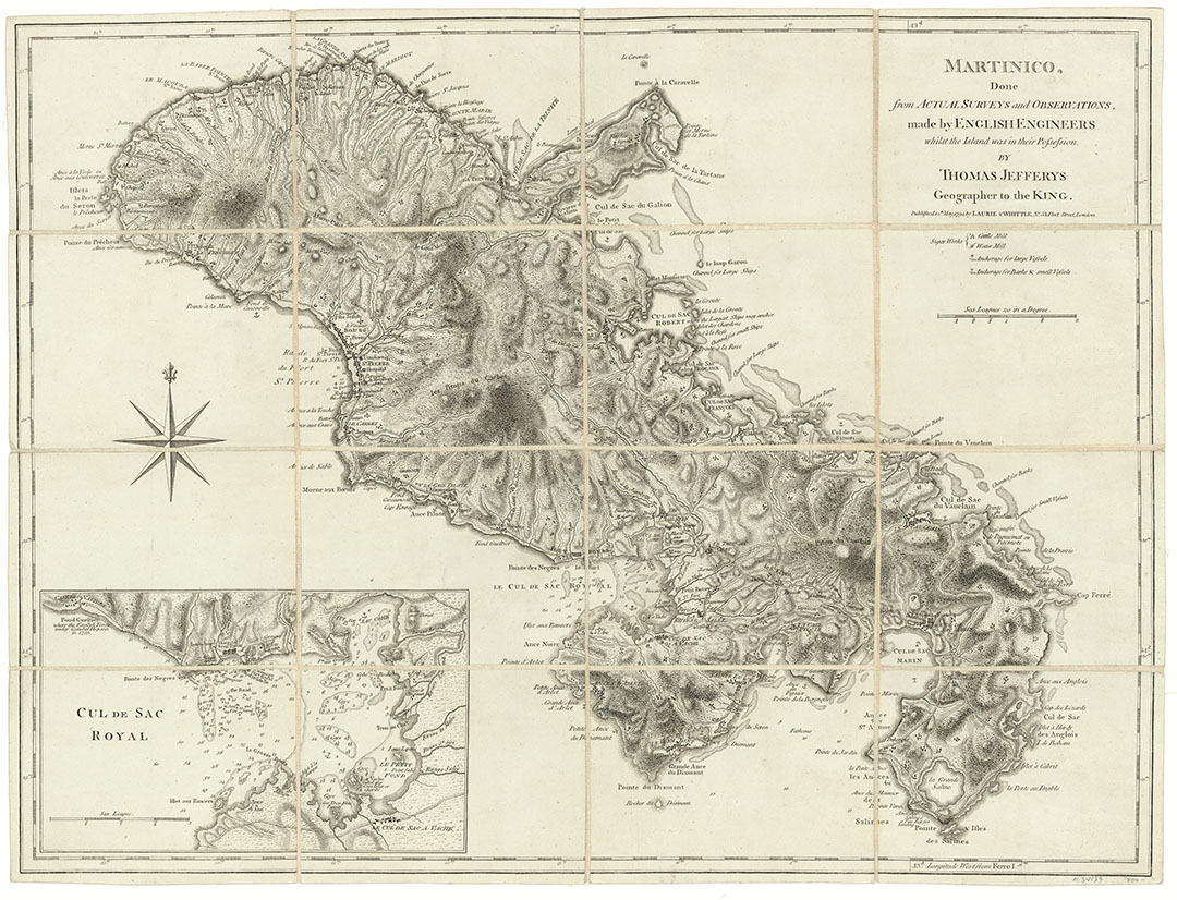 DESCRIPTION: Martinico, Done from Actual Surveys and Observations made by English Engineers whilst the Island was in their Possession, by Thomas Jefferys, 1794. This finely engraved map of Martinique was produced during a pivotal moment in colonial history, when British forces briefly held the island during the 18th century. Issued as part of The West Indian Atlas—Jefferys’ authoritative maritime atlas—this separately published version is segmented and mounted on linen, a format favored for ease of handling and preservation aboard ship or in the field. The map captures Martinique in exquisite detail, charting its towns, rivers, roads, and anchorages. In the lower left, an inset of “Cul de Sac Royal” (now Fort-de-France Bay) emphasizes the island’s vital harbor. Thomas Jefferys, Geographer to the King, was among Britain’s most skilled and influential mapmakers. His work was central to Britain’s understanding and navigation of the Caribbean during the age of empire. This map, based on firsthand British military surveys, provides not only a technical rendering of the island but also a window into the colonial tensions and territorial ambitions of the time. A superb blend of artistry, accuracy, and historical significance, this is a compelling piece for collectors of fine cartography and West Indies history alike.