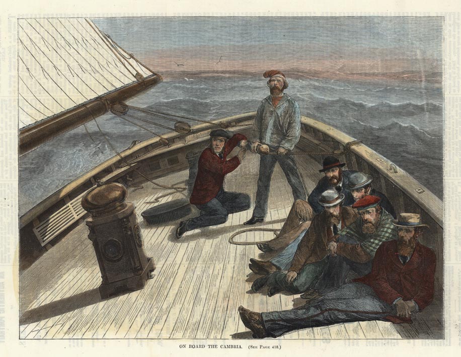 DESCRIPTION: At the tiller - seven men with different hats. Good details aboard including ships compass. The first challenge for the 'America's Cup' (so named after the yacht America) included the yacht Cambria which sailed under the British Flag.<br><br> The Cambria competed in the 1870 America's Cup race.