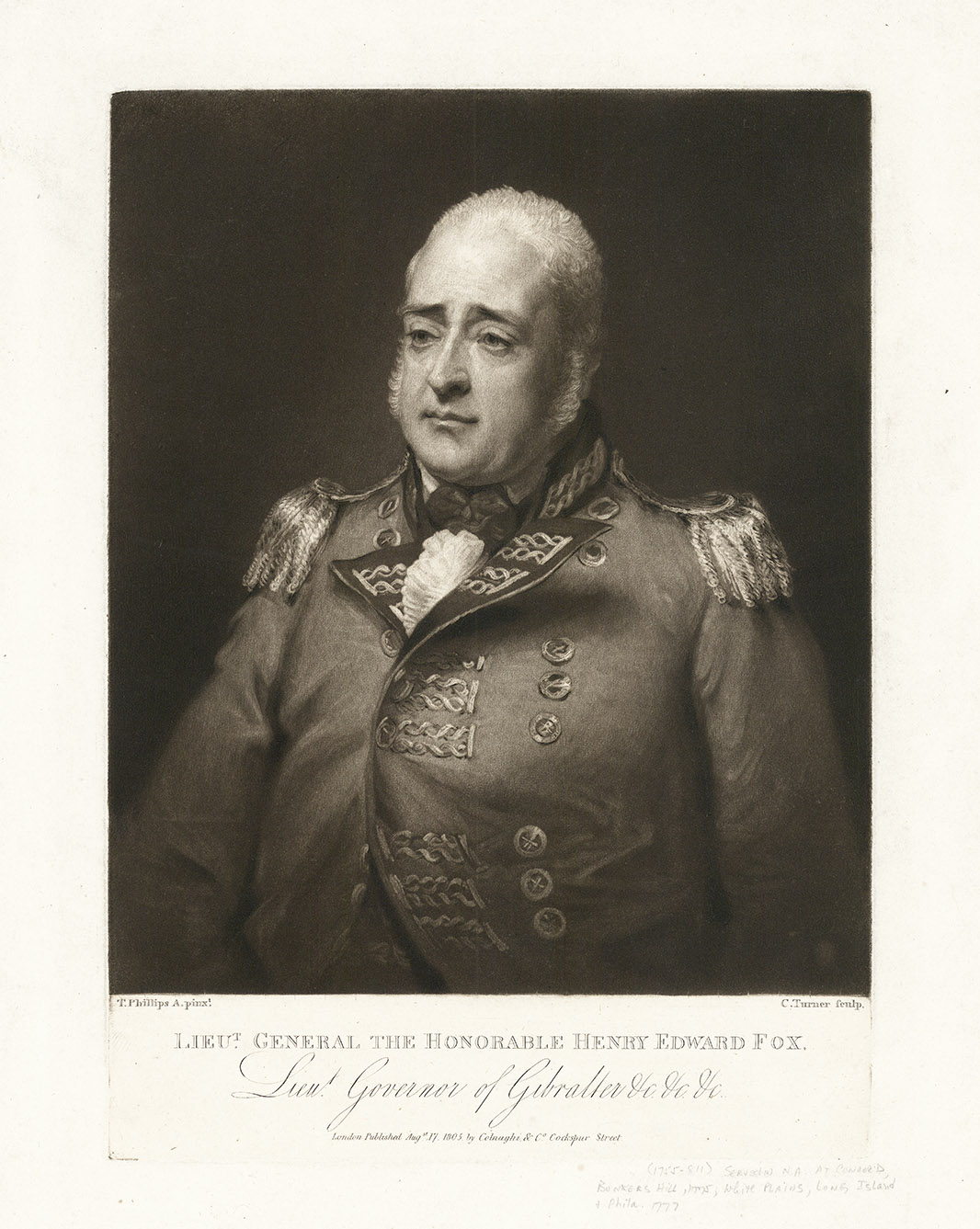 DESCRIPTION: Considered one of the most accomplished English officers to fight in the American War of Independence, Henry Edward Fox (1755-1811) was involved in almost every major battle of the Revolution. The brother of Charles James Fox, the infamous Jacobite politician, Henry began his military career in the king’s dragoon guards. <br><br> In 1773, he was promoted to a lieutenant in the 38th regiment, which was quartered in Boston. He served as captain throughout the Revolution and was present at almost every major battle of the war. He served at Concord, Bunker Hill, the battles on Long Island and White Plains, the battle of Brandywine, and the advance on Philadelphia. In 1778 he was promoted to Lieutenant Colonel of the 38th, and continued to serve in America until the end of the war. <br><br> Upon his return to England, he was made aides-de-camp to George III in recognition of his bravery and devotion. It is interesting to note that while Henry Fox was one of England’s most dedicated soldier’s in the colonies; his brother was one of the most outspoken opponents of the War. Fox continued to serve in the army and distinguished himself further by repulsing the entire French army at Pont-a-Chin. <br><br> Later he served as the governor of Gibraltar and as the ambassador to Naples. This is a stunning impression of Charles Turner’s superb mezzotint of Henry Fox. Pictured, as Governor of Gibraltar, the image is not only a fine likeness of this great soldier, but a wonderful example of Turner’s unique talents.