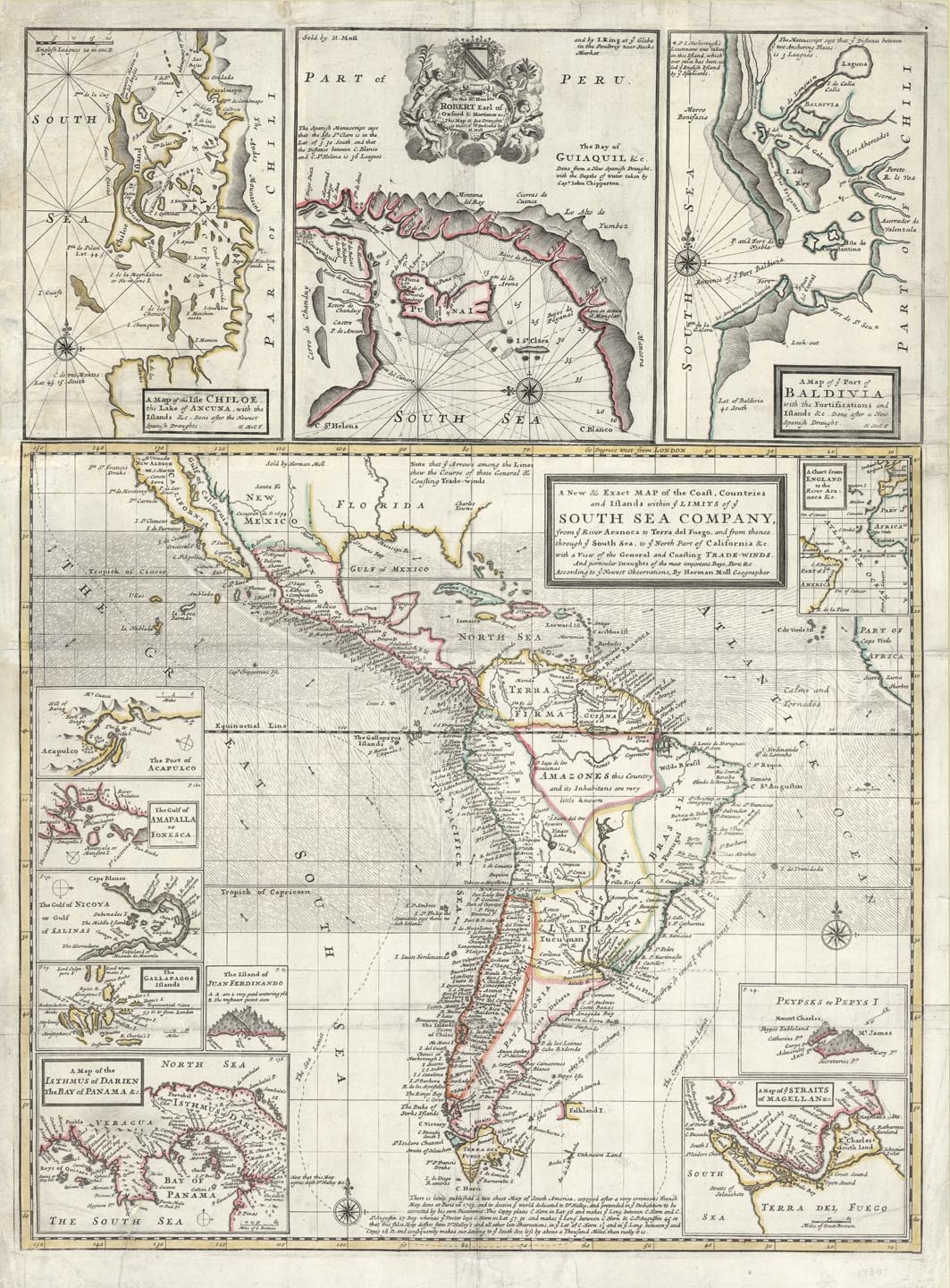 DESCRIPTION: A two-sheet map depicting Central and South America with insets titled "A Chart from England to the River Aranoca &c", "Peypses or Pepys I", "A Map of ye Straits of Magellan &c", "A Map of the Isthmus of Darien The Bay of Panama &c", "The Island of Juan Ferdinando", "The Gallapagos Islands", "The Gulf of Amapalla", and "The Port of Acapulco". The insets "A Map of ye Port of Baldivia", "The Bay of Guiaquil &c", and "A Map of the Isle of Chiloe" are attached on the second sheet, along the top third of the map. <BR><BR>The South Sea Company was a British joint-stock company founded in 1711 which had a monopoly to trade with South America as part of a treaty during the War of the Spanish Succession, when most of South America was under Spanish control. The South Sea Company’s profits and rising stock were meant to reduce the national debt, but political corruption and a stock collapse in 1720 known as the South Sea Bubble ultimately damaged the national economy. However, the South Sea Company was restructured and remained successful for more than a century after the collapse. This map labels ports and rivers in significant detail, and also marks mine locations, the directions of trade winds, the “sea limits” of the South Sea Company, European forts and settlements, and regions inhabited by Native American groups.