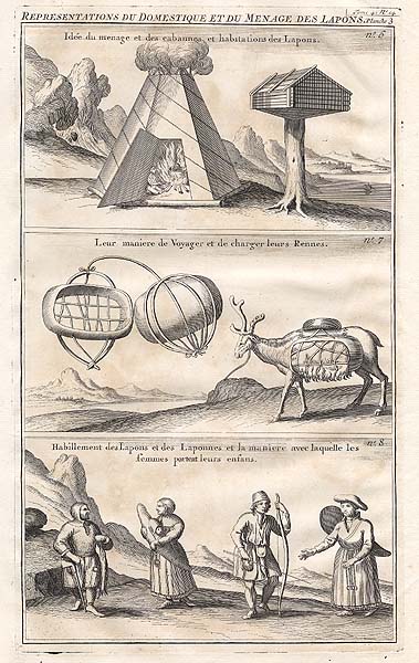 DESCRIPTION: This impressive engraving is the thirteenth plate in volume four of Chatelain’s celebrated encyclopedia, Atlas Historique. Printed in 1714, this unique engraving is from the first edition of volume four published by Chatelain as part of his large seven volume work. This fascinating sheet is one of a series of engravings from this atlas demonstrating the lifestyle and customs of the Lapps. The sheet includes three vignettes illustrating the housing and nomadic existence of the Lapps. The first image illustrates a typical Lapp house, which consists of a large tent like structure which can be easily transported. The second image shows a reindeer with various containers strapped to its back. The last vignette depicts a small group of Lapps, the men hold bows and arrows and a fishing rod, while the women cradle their children, which are safely secured in elongated baskets. This decorative sheet is a wonderful example from Chatelain’s celebrated text.