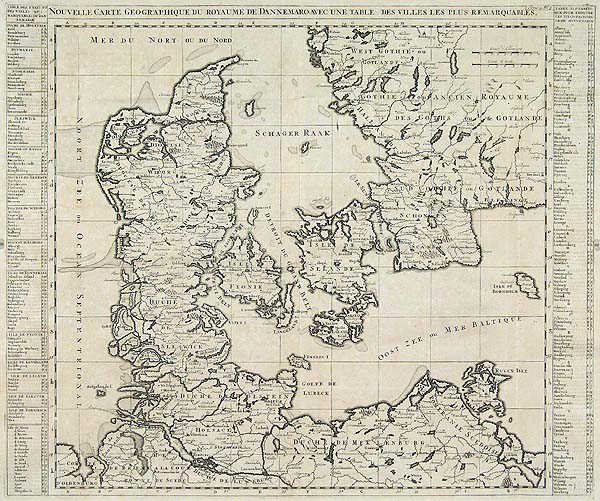 DESCRIPTION: This impressive engraving is the third plate in volume four of Chatelain’s celebrated encyclopedia, Atlas Historique. Printed in 1714, this unique map is from the first edition of volume four published by Chatelain as part of his large seven volume work. This is a lovely impression of Chatelain’s large fold out map of Denmark. The map covers all of Denmark as well as the isle of Fyn (Isle de Fyonie) and Sjaelland (Isle de Selande). The southern tip of Sweden is also included stretching as far north as Gotland, and the northern coast of Germany is also shown extending to Rugen. The Baltic, Skaggerak, and North seas are all clearly identified, and great attention has been paid to the geographical features of the area. The many waterways and mountains have all been meticulously marked and the areas of shallow water have also been depicted. Two detailed key tables are included on either side of the map identifying the principal towns and different states. By combining a wealth of historical and geographical information with delicate engraving and an uncomplicated composition, this elegant map is a superb example from the golden age of French mapmaking.