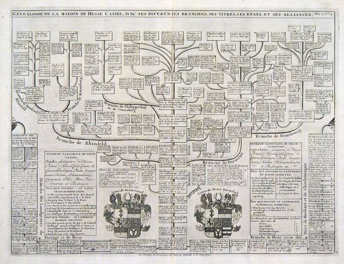 DESCRIPTION: This handsome genealogical chart is a wonderful example of Chatelain’s elegant engravings. Included in the 1720 edition of Atlas Historique, published by Chatelain in Amsterdam, this large fold out chart is the fourteenth plate in volume two. Adorned with two ornate crests, this beautiful plate outlines the family tree of the German Hesse-Cassel line. The line of Hesse-Cassel was founded in 1567 by William IV, the eldest son of Philip the Magnanimous. On his father's death he received one half of Hesse, with Cassel as its capital; and this formed the landgraviate of Hesse Cassel. This impressive chart follows the Hesse-Cassel lineage from Henry III to the branches of his descendents at the close of the seventeenth century. Their various titles and arms are all explained and the different county states are also accounted for. Chatelain has included copious biographical notes throughout, and the whole plate is carefully drawn and artistically conceived.