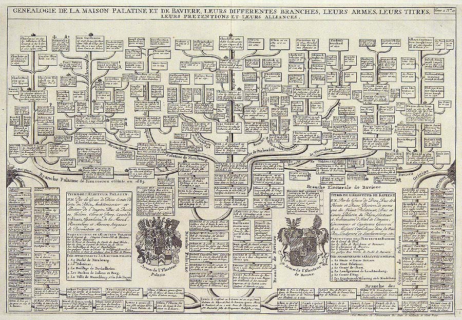 DESCRIPTION: This large genealogical chart is a wonderful example of Chatelain’s elegant engravings. Included in the 1720 edition of Atlas Historique, published by Chatelain in Amsterdam, this large chart is the eleventh plate in volume two. Adorned with two ornate coats of arms, this beautiful plate outlines the family trees of the Bavarian and Palatine rulers. Chatelain has included copious biographical notes throughout, and the whole plate is carefully drawn and artistically conceived.