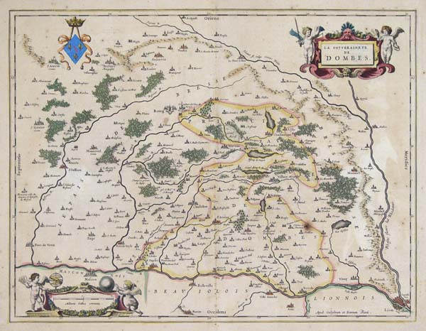 DESCRIPTION: A beautiful map from a 1640 Latin text edition of Blaeu's "Theatrum Orbis Terrarum, Sive Atlas Novis." The city of Lyons in shown in the lower right corner. Decorative putti cartouches flank both the title and scale cartouches.