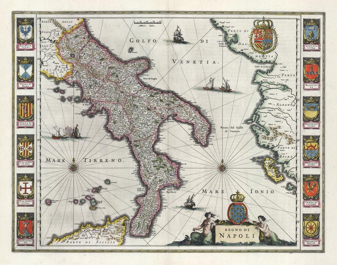 DESCRIPTION: A beautiful map of southern Italy from a Latin text edition of Blaeu's "Theatrum Orbis Terrarum, Sive Atlas Novis." Twelve armorial side panels, large title cartouche, two compass roses, and ships under sail adorn this map.