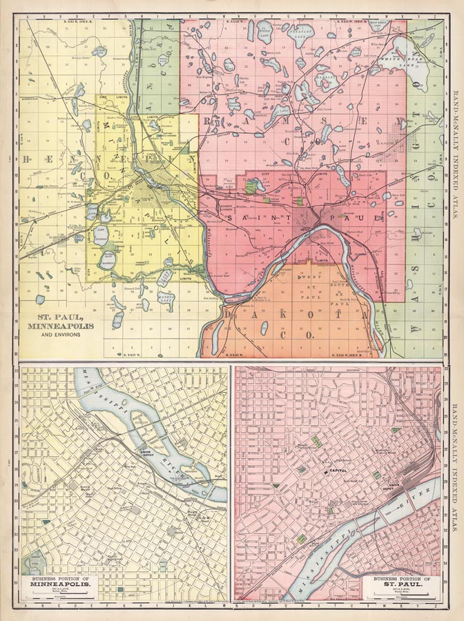 DESCRIPTION: A large detailed map from “Rand McNally & Company’s Enlarged Business Atlas and Shippers Guide.” The lower two maps show the business portions of Minneapolis and St. Paul.