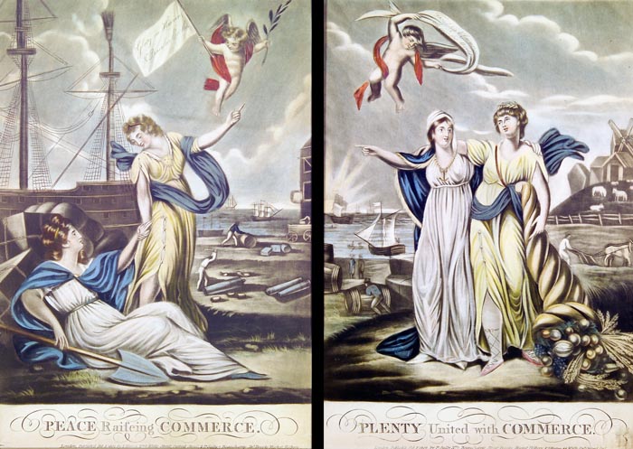 DESCRIPTION: A matched pair of allegorical mezzotint engravings. Peace Raising Commerce depicts the goddess of Peace lifting the goddess of Commerce. Background details show a laid up warship and the dismantling of a cannon. In the sky, a cherub, laurel branch in one hand and the other holds a flag with the quote, "Glory in Heaven & Peace on Earth". Plenty United with Commerce depicts the two figures arm in arm, Commerce beckoning towards the sea and Plenty holding an overflowing cornucopia. Above them, a cherub holds a banner with the quote "Friendship & Commerce all over the World."