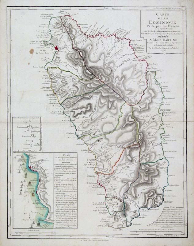 DESCRIPTION: A beautiful large-scale "battle" map of the island of Dominica. This map shows the actions taken by the French on September 7, 1778. This map has good topographical detail and notes many place names. An inset map shows French plan of attack on the British . Just above that is an inset chart of the Lesser Antilles from Antigua to Grenada.