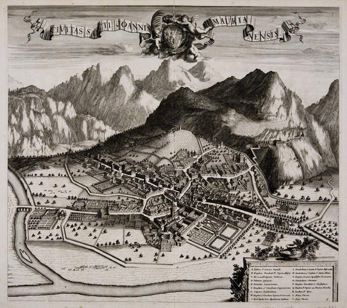 DESCRIPTION: A beautiful large-scale bird's eye view of the town of Saint Jean de Maurienne in the Savoy region of the French Alps. This view first appeared in Blaeu's townbook of Piemonte & Savoye, first issued in 1682. It was subsequently reissued by A. Mojens (1697), P. Mortier (1704-5) and by Rutgert Christoffel Alberts in 1725.